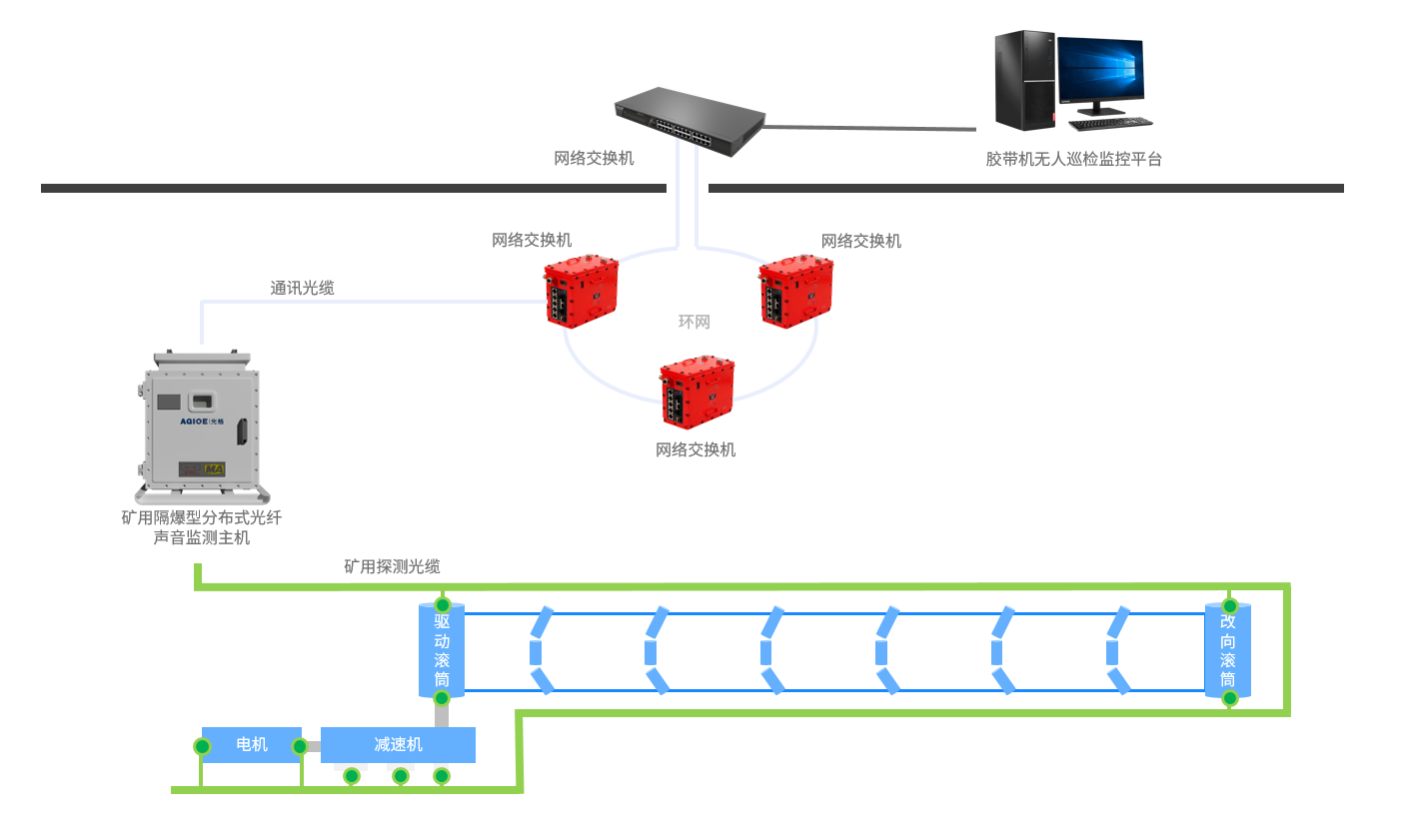 膠帶機振動(dòng)監測系統以分布式光纖振動(dòng)與聲學(xué)傳感技術(shù)為核心,通過(guò)在膠帶機兩側敷設探測光纜,對托輥、驅動(dòng)裝置、轉接料斗等關(guān)鍵設施實(shí)現運行狀態(tài)連續感知與智能診斷,為煤礦行業(yè)無(wú)人化巡檢落地及主動(dòng)安全防控體系構建提供核心技術(shù)支撐。