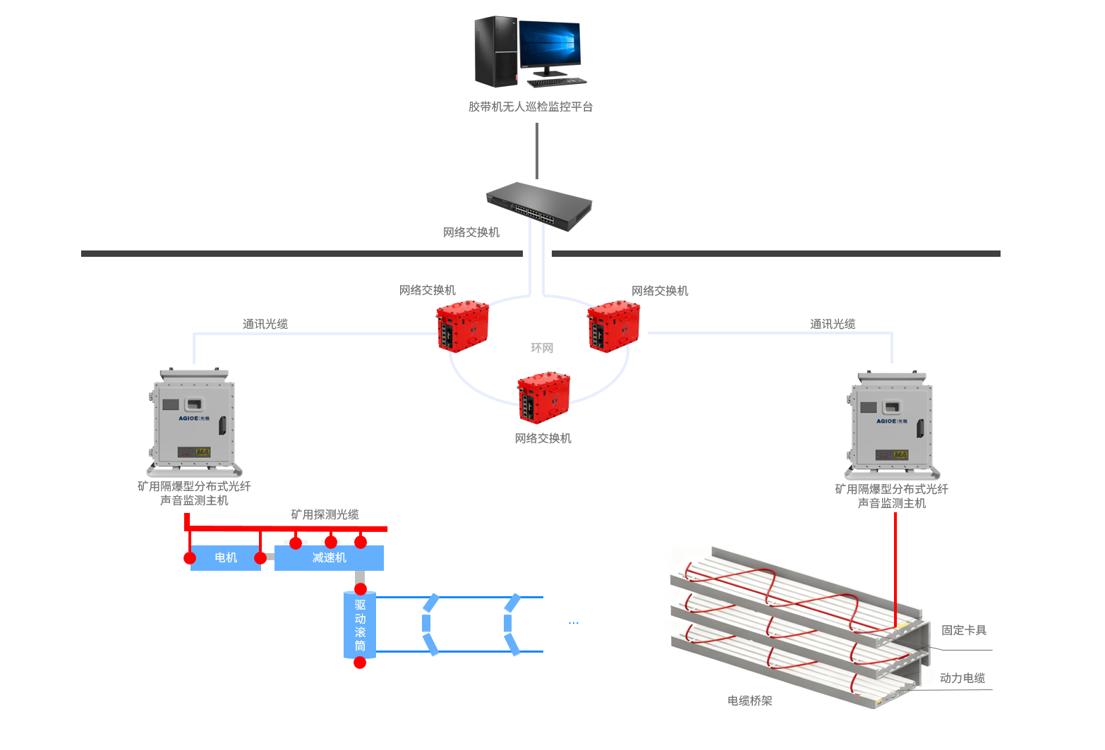 膠帶機溫度監測系統基于分布式光纖測溫技術(shù),沿膠帶機敷設感溫光纜,實(shí)現對電纜橋架、電機、減速機及滾筒等關(guān)鍵設備的全線(xiàn)精準覆蓋與實(shí)時(shí)溫度監測。系統通過(guò)智能算法分析溫度數據,能夠精準識別異常并按區域預警,實(shí)現從早期風(fēng)險識別到運行安全保障的閉環(huán)管理,顯著(zhù)提升設備壽命與運維效率。